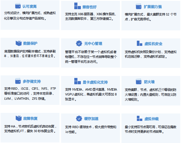 虚拟化场景融合计算和存储资源,给予具有极简 、高效 、可靠的虚拟化环境 。给予 OS 一键式交互安装,支持业务的快速上线,灵活扩展 。对各类资源统一管理,按需分配,支持一键巡检 、历史性能数据统一监控 。支持第三方虚拟化管理平台 、CDP 保护平台 。支持数据多副本及 EC 技术 ,大幅提升用户可得容量 。给予多种安全可靠策略 ,HA 高可用 、备份计划,虚拟机保护,保障业务陆续在 。